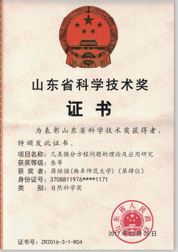 2017年5月蒋继强获山东省科技技术三等奖