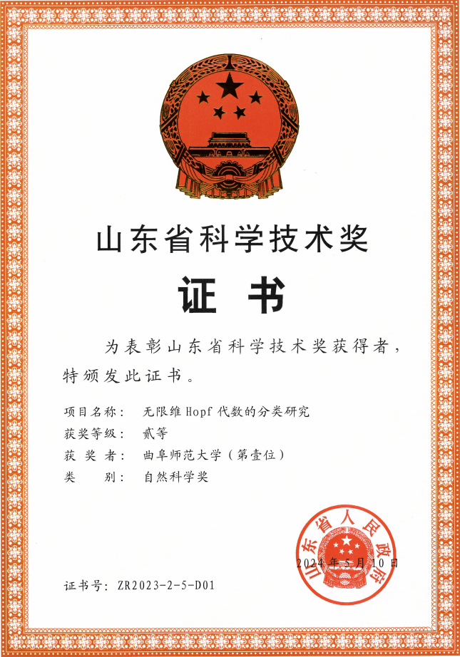 王顶国教授和许勇军副教授完成的《无限维Hopf代数的分类研究》荣获自然科学奖二等奖。