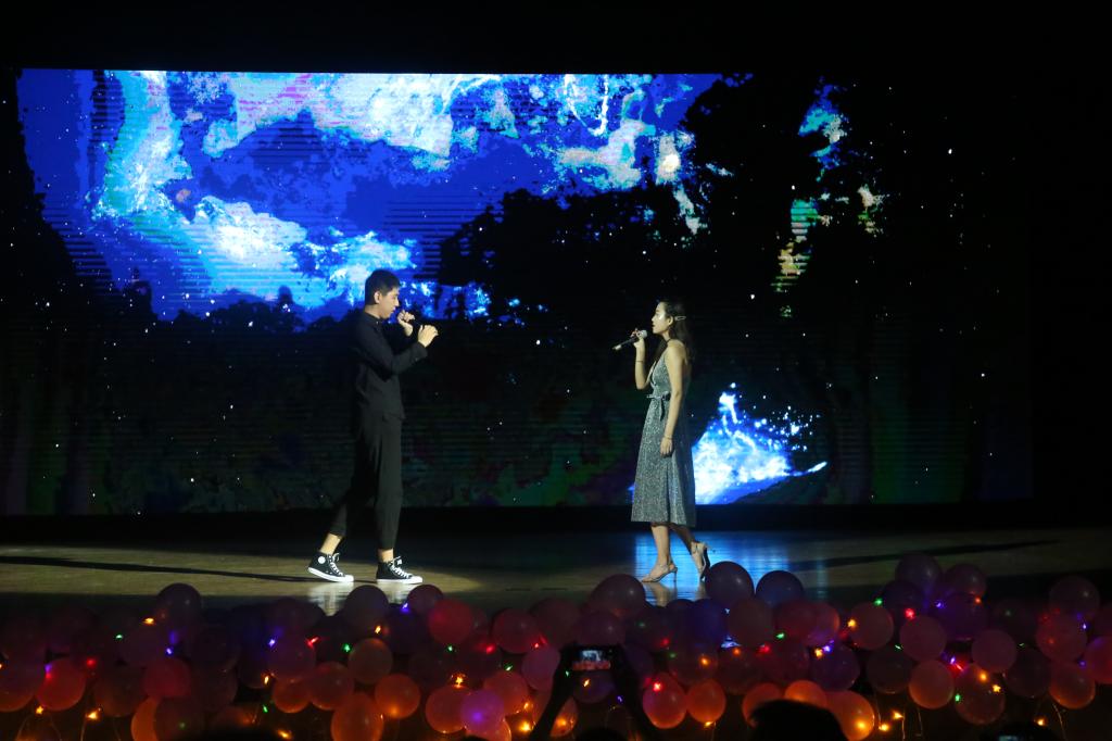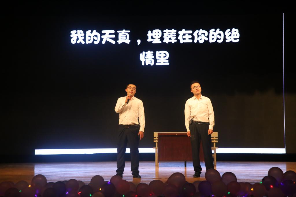 全体教师对2015级毕业生顺利完成学业致以了热烈的祝贺和衷心的祝福。在座2015级毕业生的四年回忆随着开场视频的播放慢慢涌现,在主持人诙谐风趣的台词串联下,歌曲、舞蹈、小品、相声接连登上舞台,一次又一次点燃在场观众的热情。本场晚会内容丰富,形式新颖,原创歌曲《你的童年》谱写着同学们对美好青春的回忆,精彩小品《兄弟,别闹》演绎着同学之间的深厚的友情。2015级班长团支书共同表演《你曾是Super star》,辅导员郅艳梅登台寄语,表达了对毕业生们的不舍,展现了师生间深深的情谊,将整场晚会推向了高潮。在歌曲《仰望星空》的旋律中,所有表演者走上舞台,向大家挥手告别,晚会接近尾声。