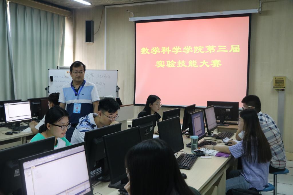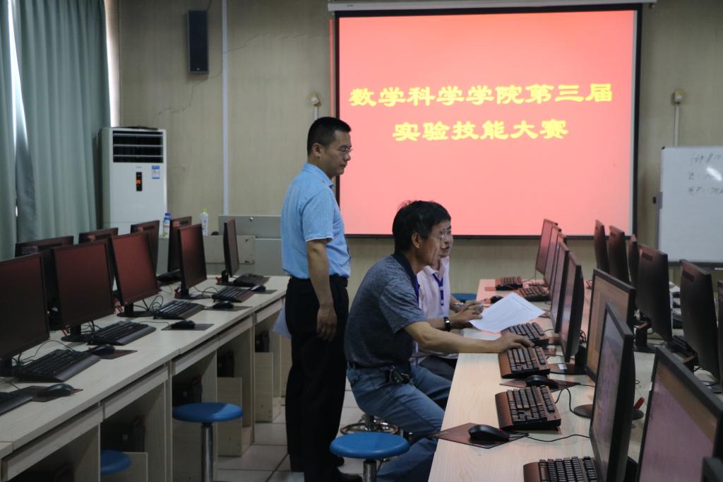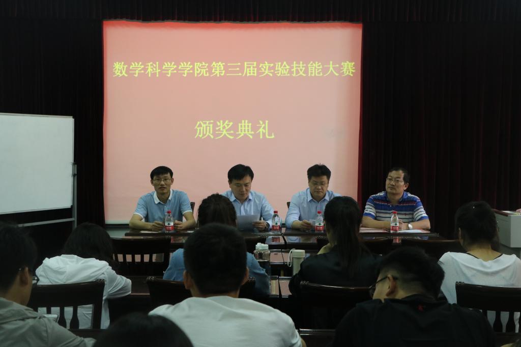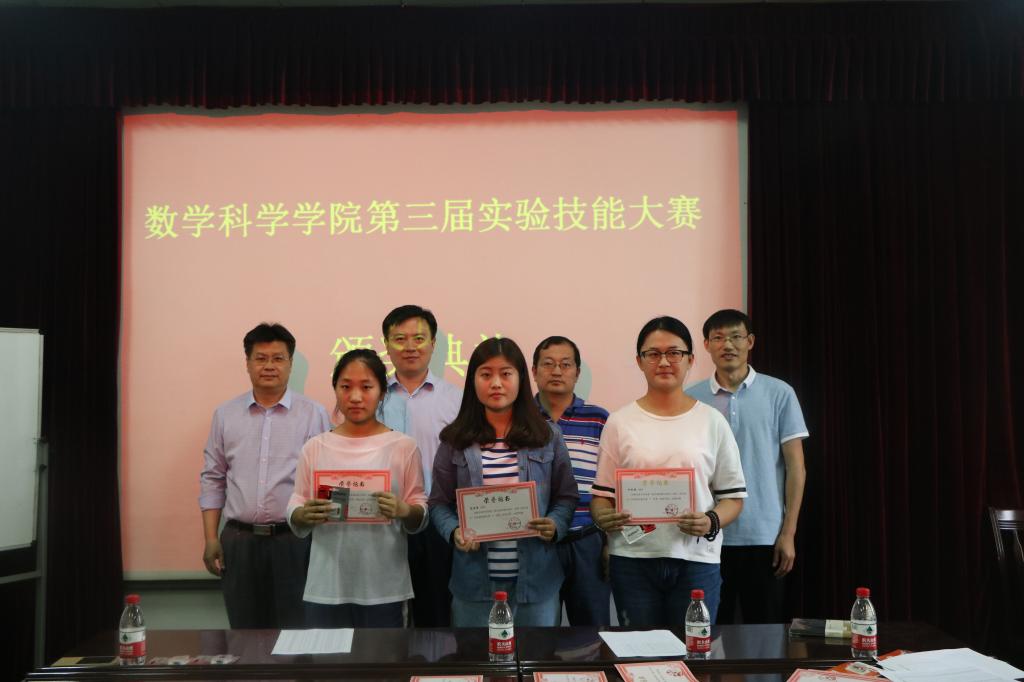 党委书记屈跃宽、副书记刘建新为获奖同学进行颁奖。本次实验技能竞赛分数学软件组和算法设计组两个组别, 共有143名学生报名参加,其中数学软件组有29人,程序设计组有114人。竞赛内容涵盖数学分析、高等代数、概率与数理统计、常微分方程、数论、数学实验、数学模型、数值分析、C语言程序设计、数据结构、C++面向对象程序设计等专业课程,考察学生借助相关软件解决数据抽象、数值求解、系统仿真和程序设计的能力。专家评委在现场打分、统计分数并进行评奖,最终共评出一等奖5名、二等奖15名、三等奖27名。