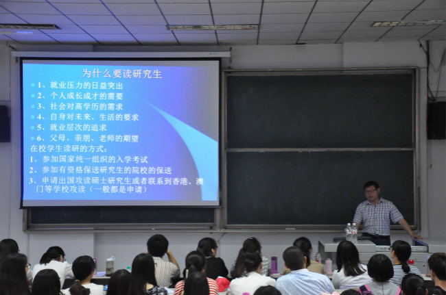 新学期以来,2013级同学们开始进入备战考研的状态。在本次讲座中,王作茂首先为大家解读了“考研”二字的含义,通过举例和分析历届录取分数线鼓励大家确定目标、努力学习,并指出复习要有计划性、报考要切合自身实际。他针对近年的考研形势和政策变化,对怎样选专业和学校进行了详细介绍,并建议同学们确立“先定专业后选学校”的主体思想,使同学们对考研过程有了一个更具体清晰的认识。