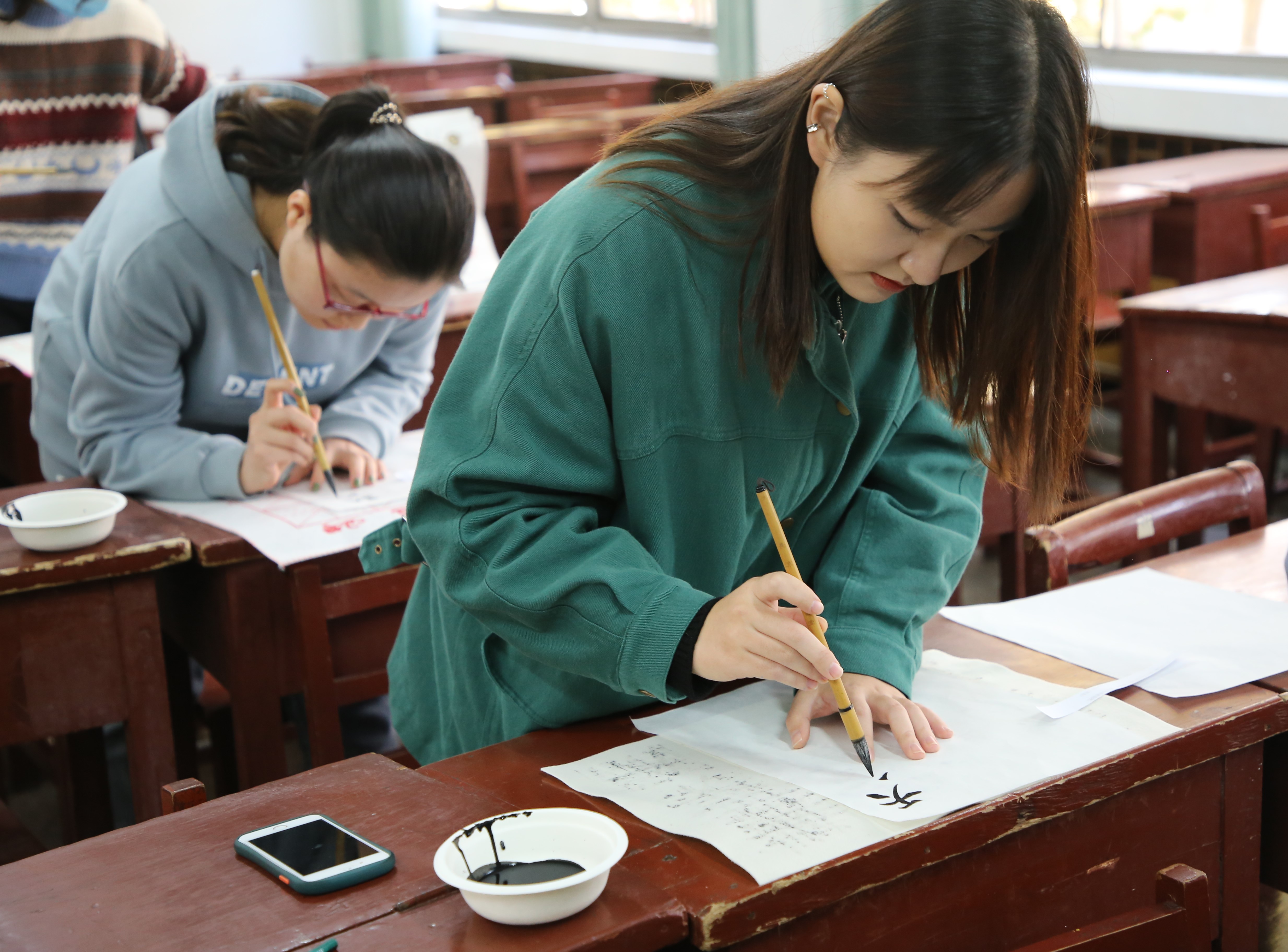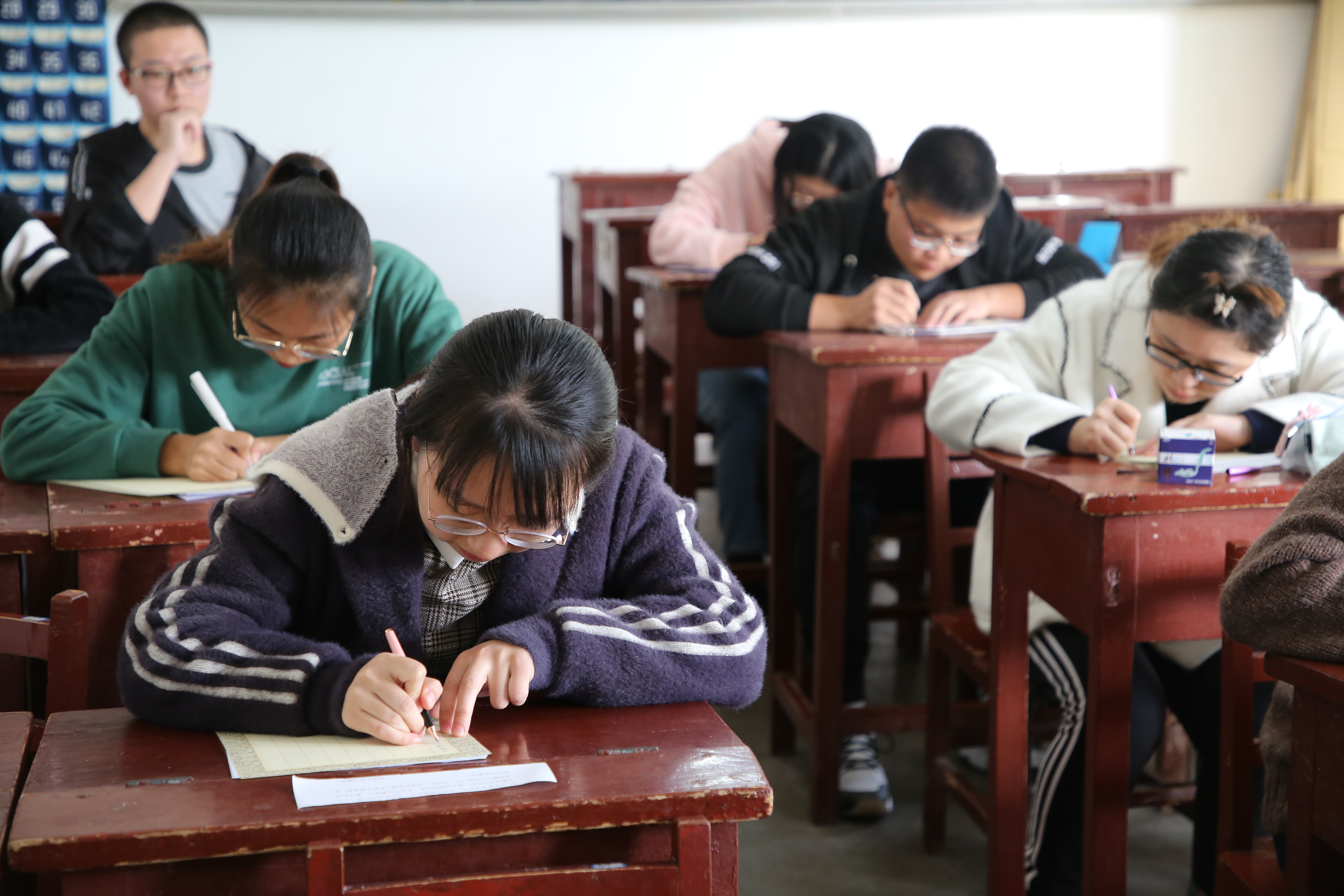 大赛有条不紊地进行,钢笔字、毛笔字、粉笔字赛场分别被安排在不同的教室中进行。纪检部、学习部的成员负责讲解比赛规则及注意事项,他们秉持“公正、公开、公平”的原则进行监考。参赛成员在赛场上不慌不乱、沉着冷静,他们将自身对书法的情感领悟倾注在一笔一划中,娴熟的手法与优美的诗句结合,黑板、纸张上栩栩如生的文字彰显着他们自信的姿态。