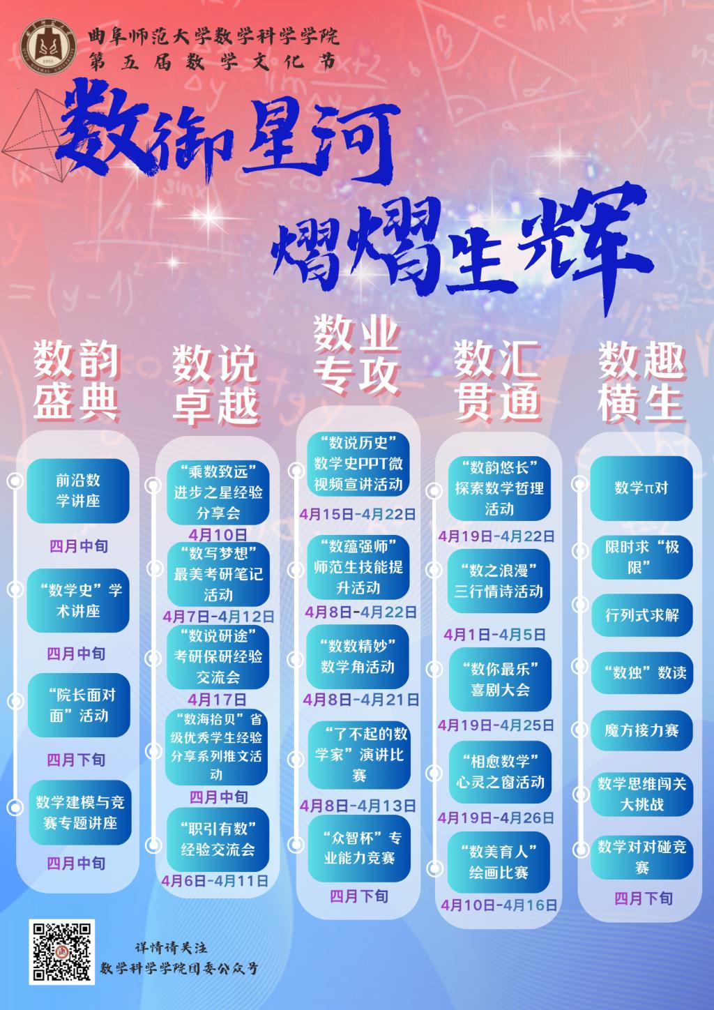 积极响应,迅速行动,启动了“曲园数学角”,开展“每日一题”和基础课程“章章通”等活动;成立了杏坛学堂卓越班,探索拔尖人才培养新模式,开启了一系列有意义的探索。本届数学文化节以“数御星河,熠熠生辉”为主题,共分为“数”韵盛典、“数”说卓越、“数”业专攻、“数”汇贯通、“数”趣横生五个主题,以服务学生成长成才为目标,以弘扬数学文化、传承数学家精神为主线,是立足数学学科特色打造的育人品牌活动。下一步,足球资讯网