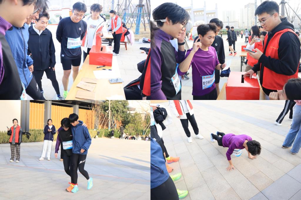 运动员抽中俯卧撑挑战,运动员代表王成真沉着应对,以规范协调的动作迅速完成比拼;同心致远环节的两人三足项目中,王奕然与韩思宇同学步调一致、配合无间,用高度默契诠释了团队协作的真谛。