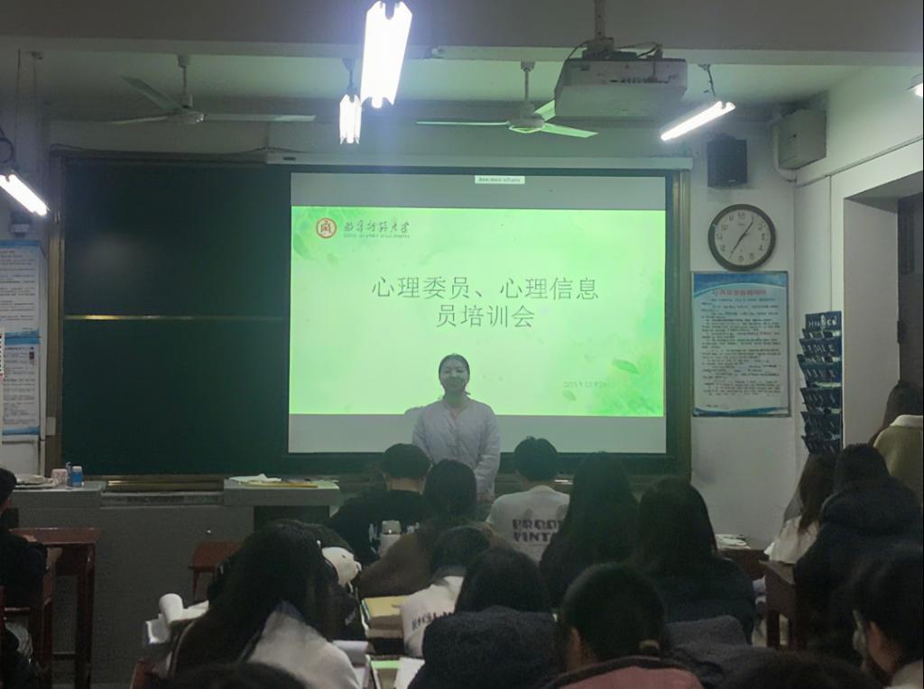 于11月15日在数学楼203教室召开心理委员与心理信息员培训会。本次会议由心理辅导员韦宁主讲,各班心理委员、心理信息员参与培训。