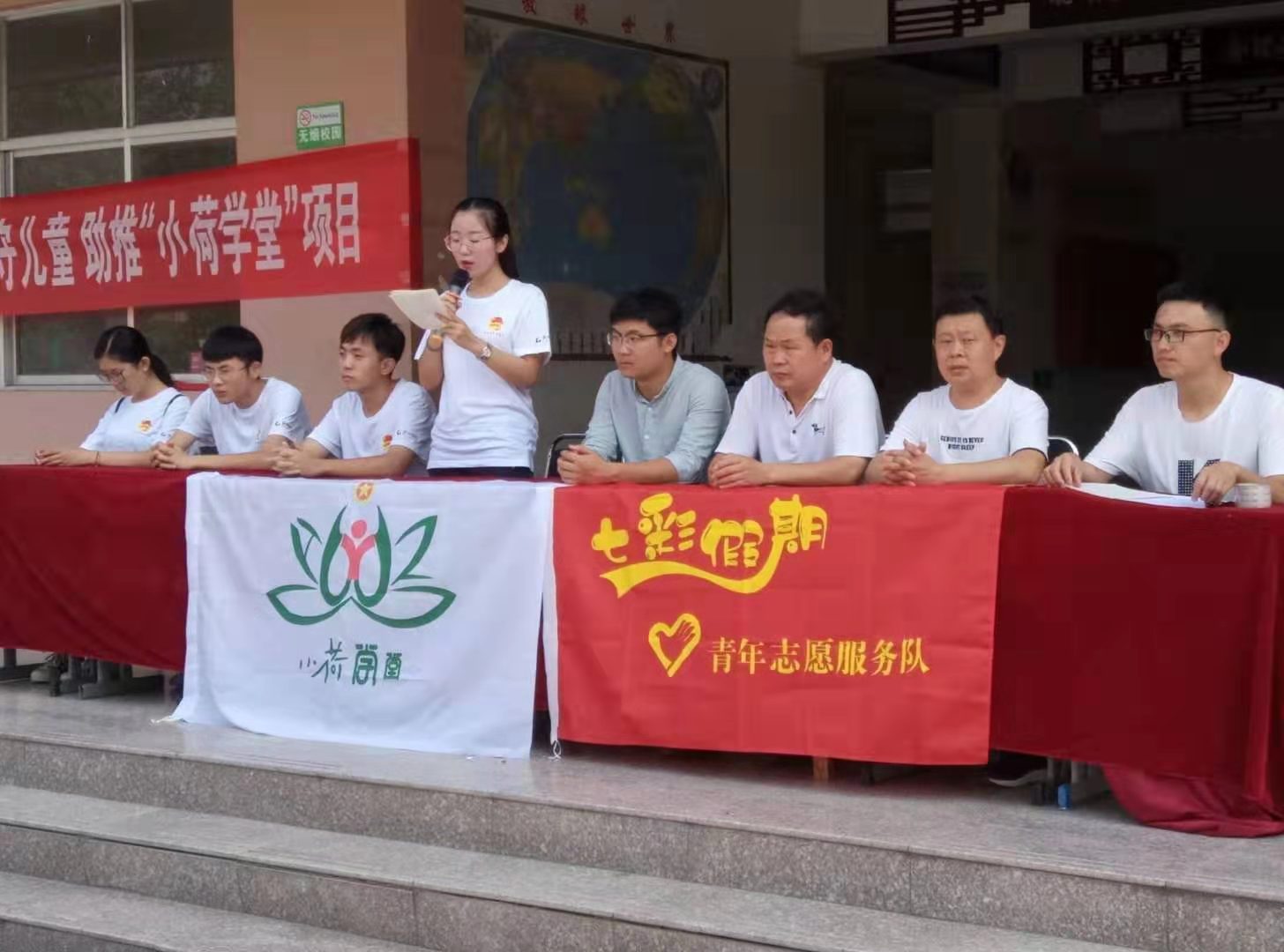 开学第一天,早上8:30,迎着清晨第一抹阳光,在安兴镇中学教学楼前进行了“小荷学堂”开学典礼,王书记、梁校长、志愿服务团队长分别对“小荷学堂”相关事宜进行发言,预祝小荷学堂为期两周的志愿服务圆满成功。晴朗的阳光,和煦的微风,拂过教学楼前孩子们天真的脸上,孩子眼中是对“小荷学堂”满满的期待,志愿服务团的队员们看着孩子们的目光,心中暗暗决定:一定会给孩子们带去新的光芒,“小荷学堂”必定完美成功!