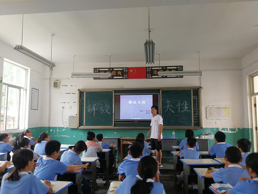 7月16日,开学第二天,志愿服务团给同学们上了趣味英语、电影赏析、古诗鉴赏课。趣味英语课上老师给孩子们讲了单词,纠正了孩子们的单词发音,让同学们对英语单词有更正确的认识。随后,志愿服务团中擅长音乐的队员教孩子们唱了《do rei mi》英语歌,同学们欢快的歌声充盈着整个教室,满满都是音符飘荡在耳畔。