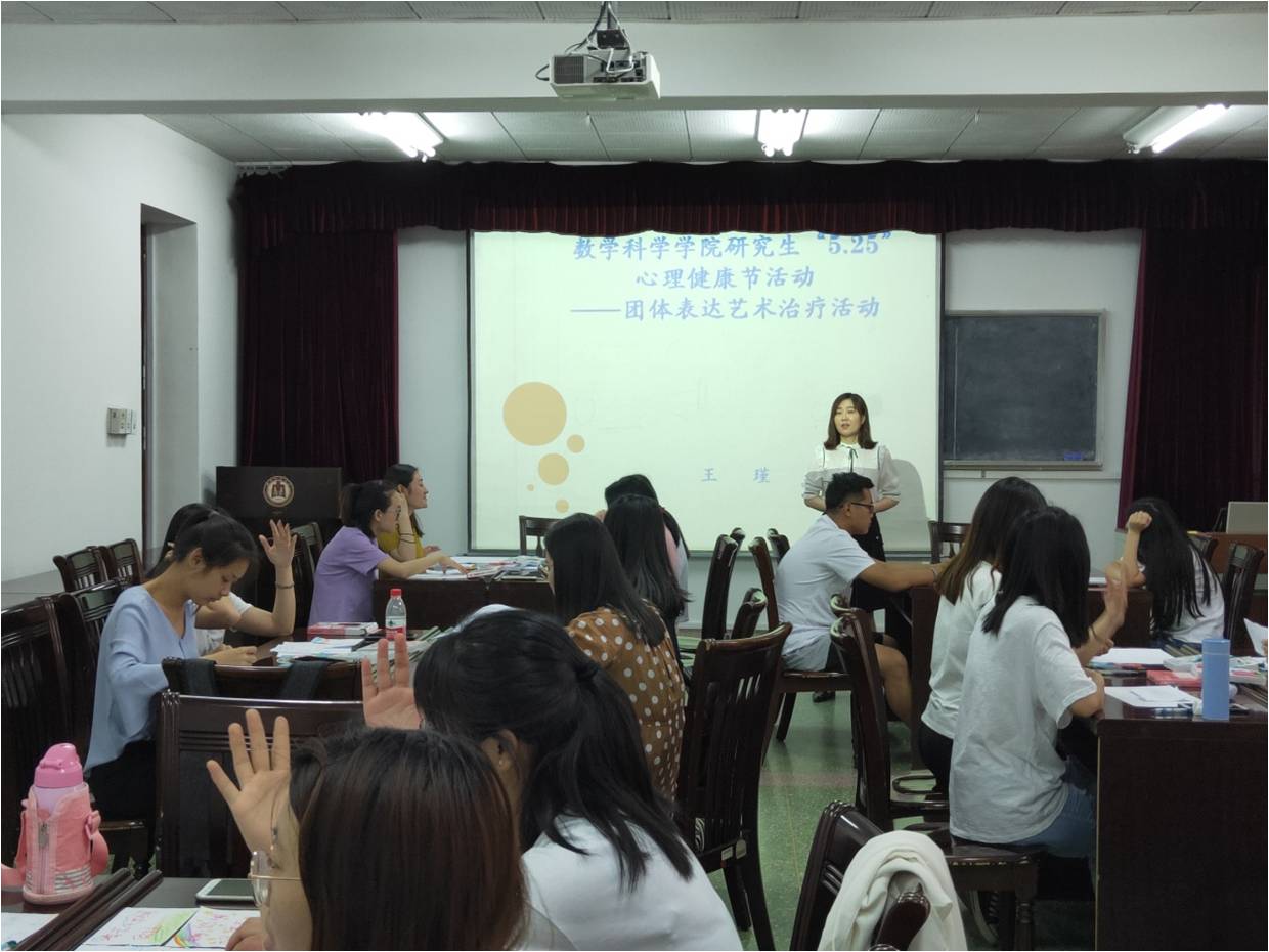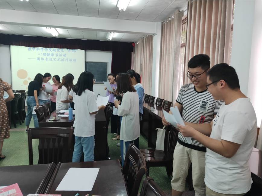 于2019年5月24日下午举行了“5.25”心理健康节——团体表达艺术治疗活动。活动旨在培养研究生自信自强、积极向上的健康心态,促进研究生心理健康素质与思想道德素质、科学文化素质协调发展。本次活动由研究生辅导员、国家二级心理咨询师王瑾老师开展进行,活动通过运用团体表达艺术治疗中音乐、绘画的方式,引导大家关注内心感受与心灵历程,在抒发心声、聆听他人的同时,进一步了解自己,培育理性平和、积极向上的健康心态。