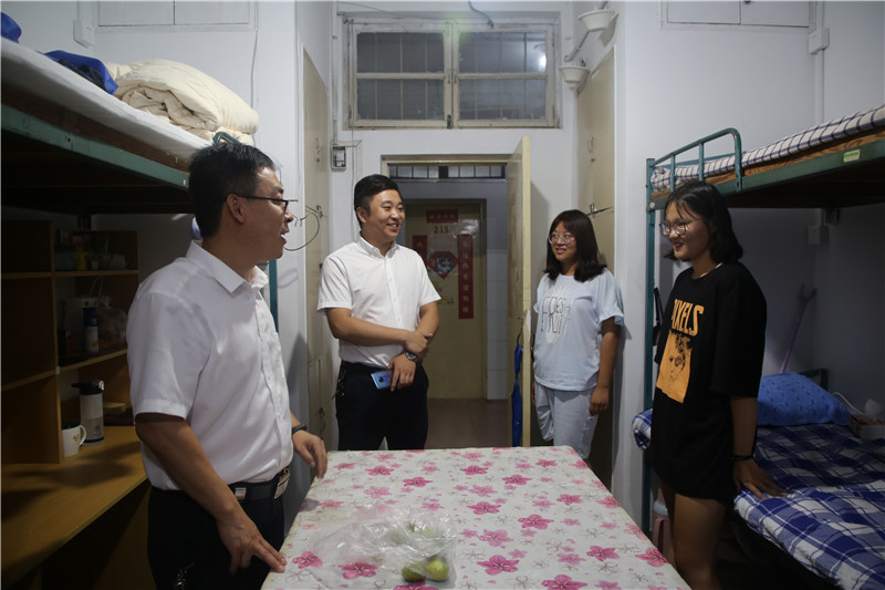 党委副书记曲凤东和2019级新生辅导员徐腾飞特意走访新生宿舍,为同学们送去亲切的关怀。