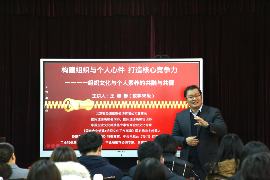 邀请88级校友、北京智益德管理咨询有限公司董事长王谦修作了题目为“构建组织与个人心件 打造核心竞争力——组织文化与个人素养的共融与共情”的报告。报告会由足球资讯网
