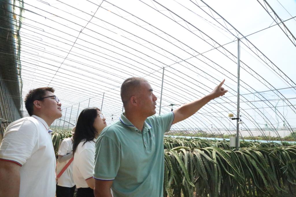 随后,实践队成员跟随工作人员进入了火龙果大棚进行参观学习。工作人员首先介绍了这一热带水果的种植方法和生长习性,然后着重介绍了整个大棚中的农业常识和科技元素,火龙果对生长温度要求较高,因此大棚采用半地下式大棚,保温土墙足有七八米厚,高温时适当保留地面杂草,以防止土壤温度过高危害火龙果根系、增加土壤保水性和空气湿度,同时在大棚侧边和顶部设置通风口来达到控温目的。此外,大棚中也随处可见各类新技术,全覆盖大型水肥一体机、智能温控、自动补光等技术,在棚顶塑料膜喷涂防晒材料控制温度,利用新科技助力作物成长。在这种精耕细作下,一个大棚所包含的两亩多地,一年能收获一万多斤火龙果,为农民带来较高的经济效益。但技术人员也在不断探索,希望能够寻找新的授粉方式替代耗时耗力的人工授粉,降低培育成本。新科技带来了新发展,而农民智慧也创造了巨大的价值,工作人员也会利用富余土地进行套种,节约土地的同时增加种植的经济效益。“智慧农民”与“智慧农业”紧密相连,科技的力量支撑着现代农业蓬勃发展。