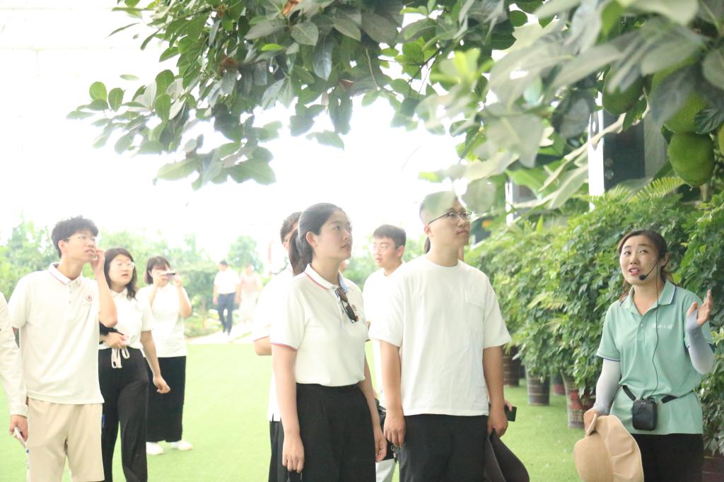 讲解员带领队员参观了智能化热带作物大棚,棚内有芭蕉、木瓜、菠萝蜜等热带植物40多种。参观过程中,实践队成员针对大棚的温度、适度控制系统,热带作物习性等向工作人员提出了一系列问题,工作人员表示,控温、控湿、上肥技术都已经现代化,比如低于一定湿度会自动喷淋,雨季湿度太大会自动吸湿排放。大棚中有棚顶通风系统等系统,且大棚外有深井,工作人员巧思利用低温的井水在棚内循环,降低酷暑时节的高温,使室温保持在30-35摄氏度之间,为热带作物的生长提供适宜的温度,新科技和农民智慧扎根在广袤的大地上。此外,园区还通过分布在各个棚内的感应器,对农业生产环节的空气温湿度、光照度、二氧化碳浓度、土壤温湿度等信息进行采集,为园区提供精准的生产管理依据。