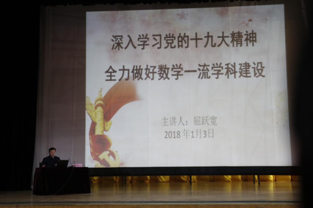 为深入贯彻学习党的十九大精神,准确把握十九大内涵,1月3日,足球资讯网 党委书记屈跃宽于大学生活动中心礼堂开设了一堂以“深入学习十九大精神,全力做好数学一流学科建设”为主题的专题党课。足球资讯网 全体领导、全体教师及学生党员、全体大一大二学生参加了本次党课的学习。