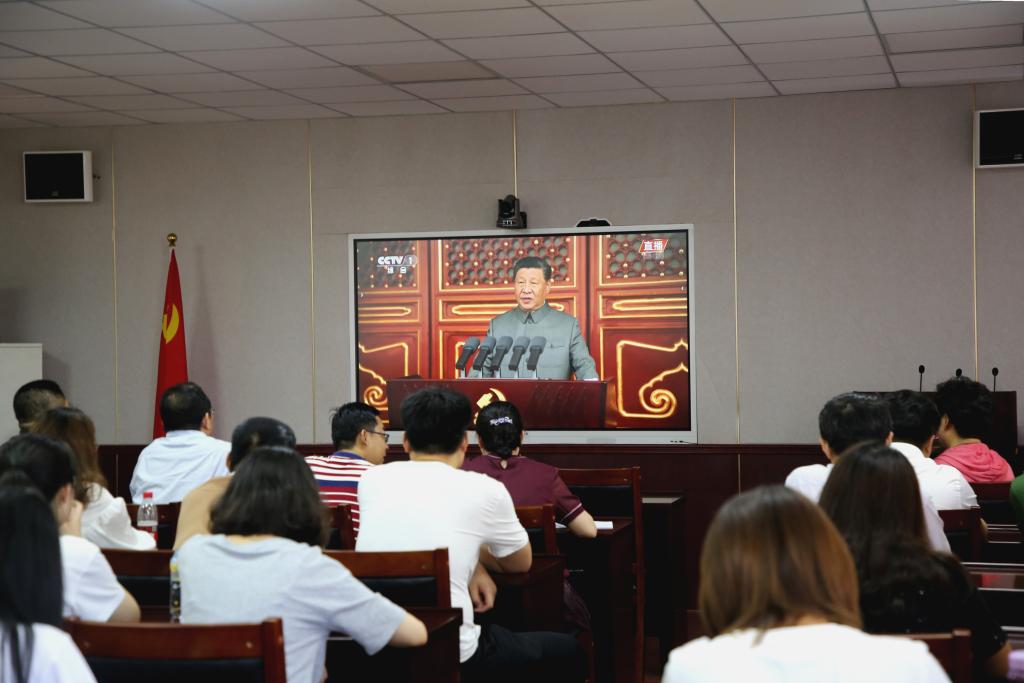 庆祝大会在56门礼炮100响声中盛大开幕,在激昂的国歌声中,全体师生起立,共同高唱国歌,见证天安门广场上的五星红旗冉冉升起。习近平总书记的讲话让观看现场沸腾,全体党员与直播同频共振,掌声阵阵、欢呼声阵阵。观看大会直播后,师生饱含深情同唱《歌唱祖国》,祝贺中国共产党成立100周年,祝福伟大祖国更加繁荣昌盛。